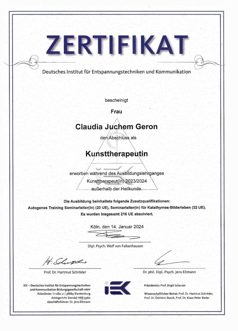 Als Kunsttherapeutin möchte ich Menschen helfen, ihre Emotionen und Erfahrungen zu verarbeiten und ihre Selbstwahrnehmung und Selbstakzeptanz zu stärken. Ich bin davon überzeugt, das die Kunsttherapie eine wertvolle Ergänzung zu anderen Therapieformen sein kann, und Menschen dabei unterstützen kann, ihre psychische Gesundheit und ihr Wohlbefinden zu verbessern.